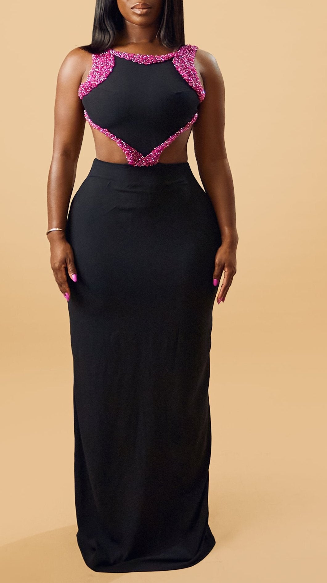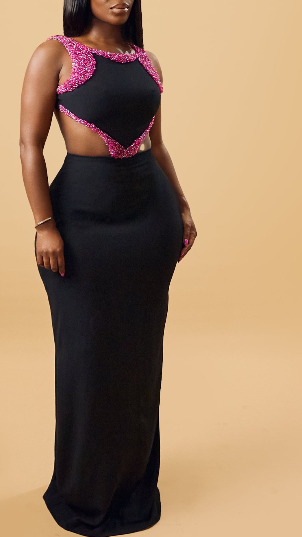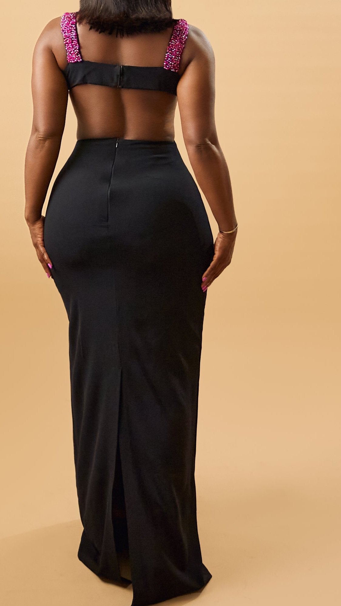 This elegant long dress is designed from sumptuous black crepe fabric and features a refined neckline adorned with striking magenta crystal beading. It has a flattering cut-off waist, adding a flirtatious touch to its sophisticated design. Ideal for formal events, this dress seamlessly merges timeless elegance with a hint of playful charm.