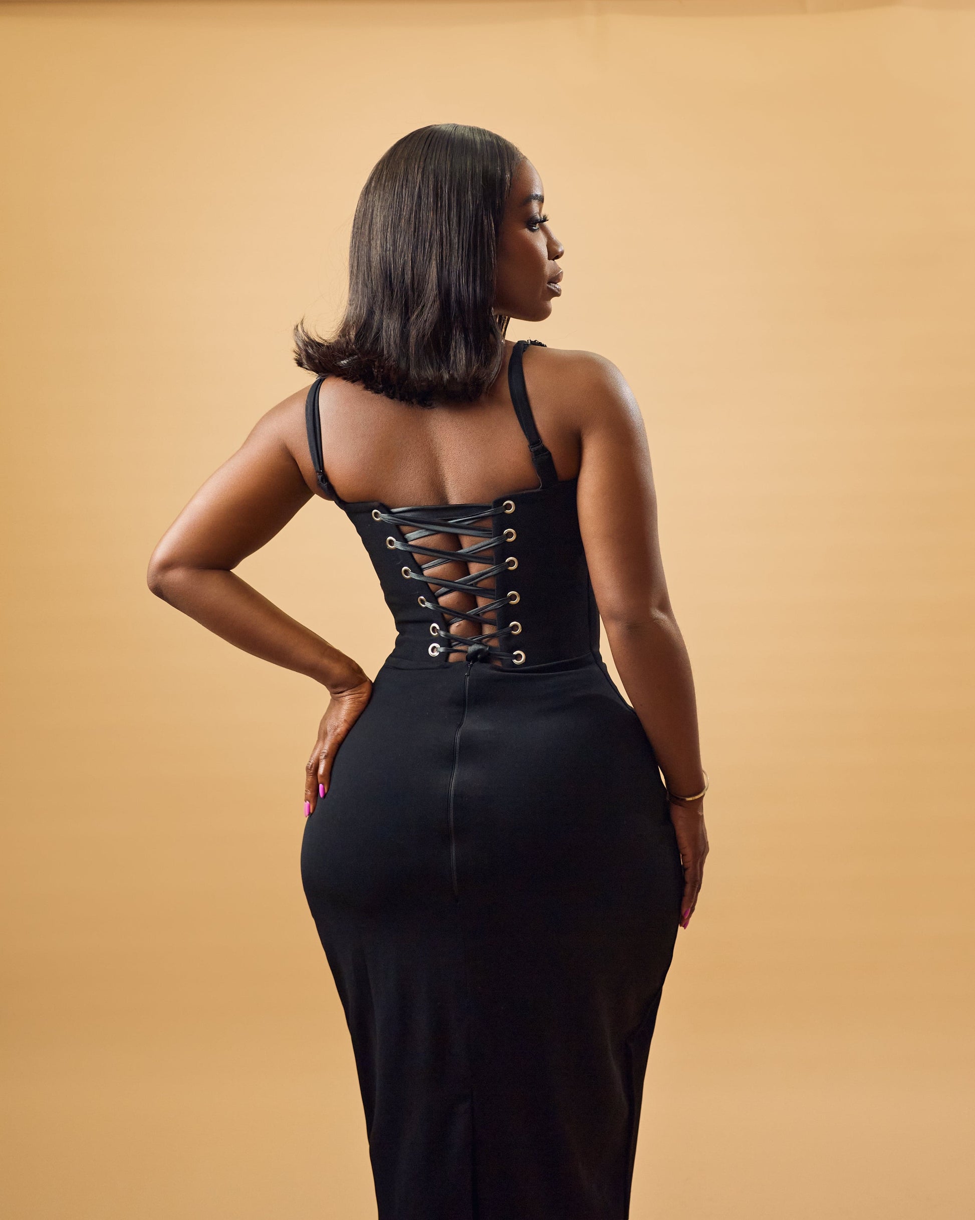 This elegant long dress exudes sophistication with its sleek design and luxurious materials. Crafted from black crepe fabric, it drapes beautifully, offering a timeless and flattering silhouette. The bust cups being the focal point, hand beaded with intricate sable crystal beading and stones that sparkle subtly, adding an air of opulence. This exquisite detailing elevates the dress, making it ideal for formal events where you want to exude grace and modern elegance.