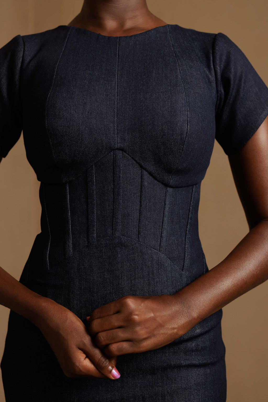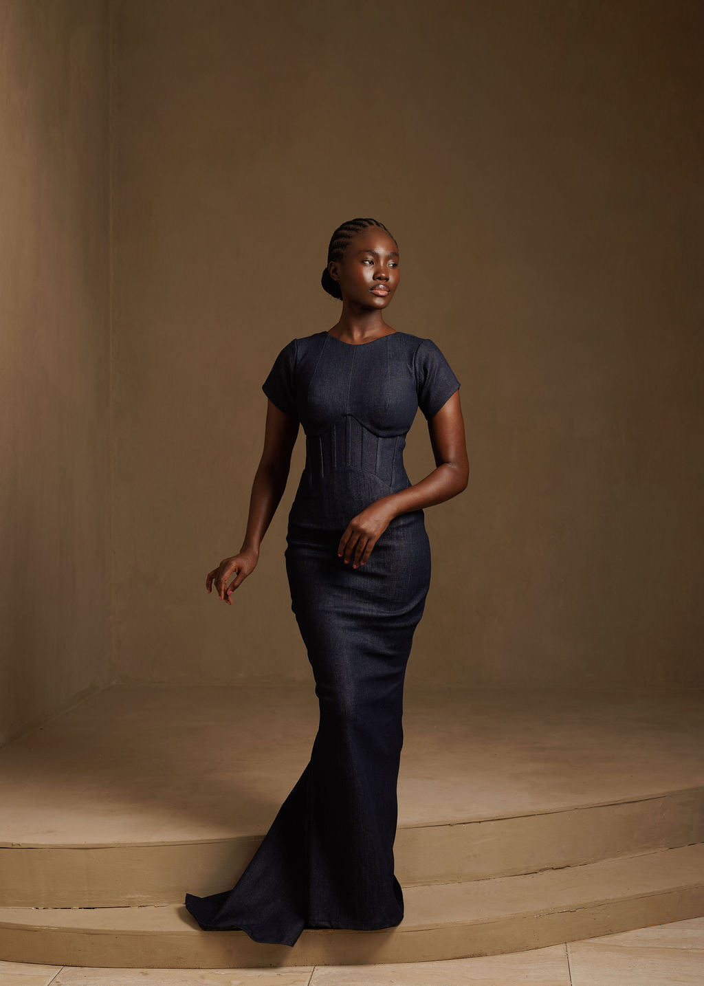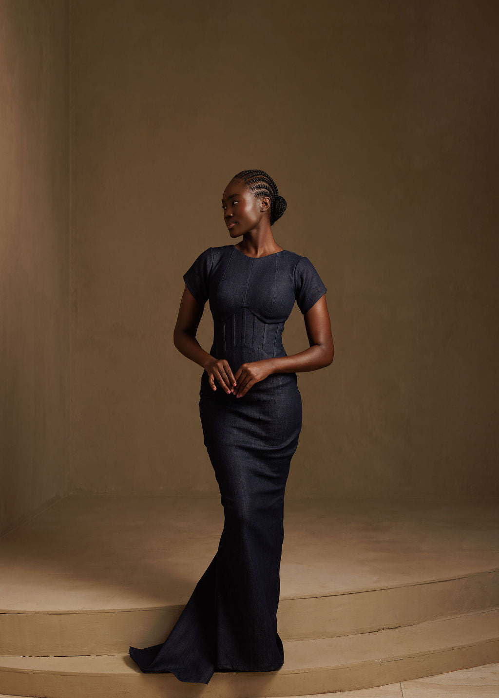 A refined balance of structure and softness. Crafted from denim with a touch of elasticity, this gown contours the body with ease while maintaining its sculpted silhouette. Visible boning lines trace the seams, offering soft corset-inspired shaping. With short sleeves, dual back zippers, and a fishtail finish, Idara commands attention while staying wearable.