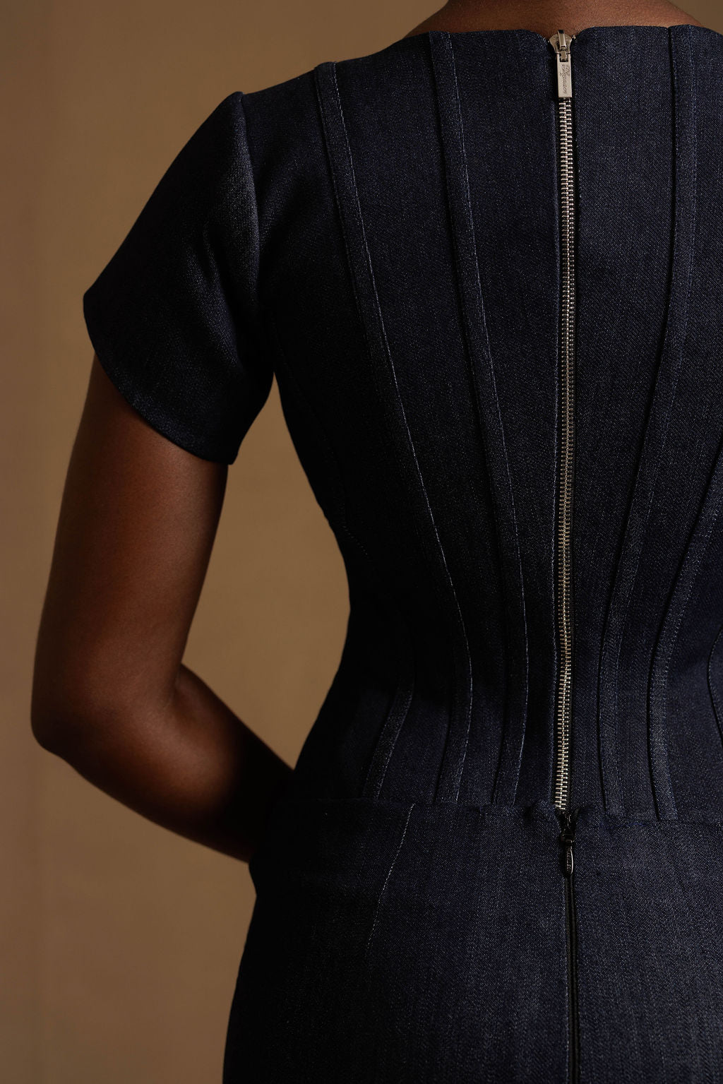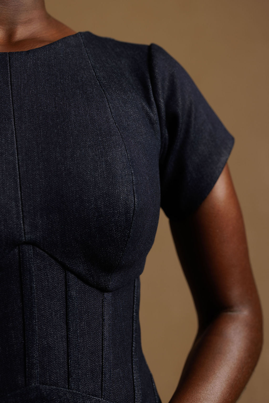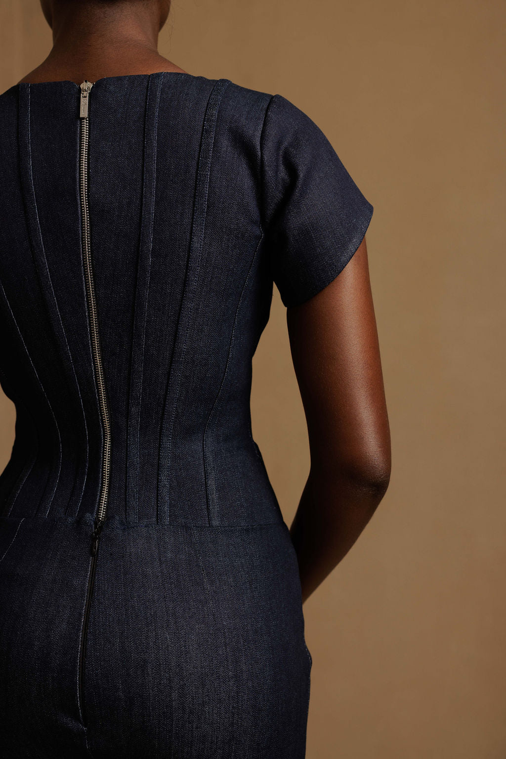 A refined balance of structure and softness. Crafted from denim with a touch of elasticity, this gown contours the body with ease while maintaining its sculpted silhouette. Visible boning lines trace the seams, offering soft corset-inspired shaping. With short sleeves, dual back zippers, and a fishtail finish, Idara commands attention while staying wearable.